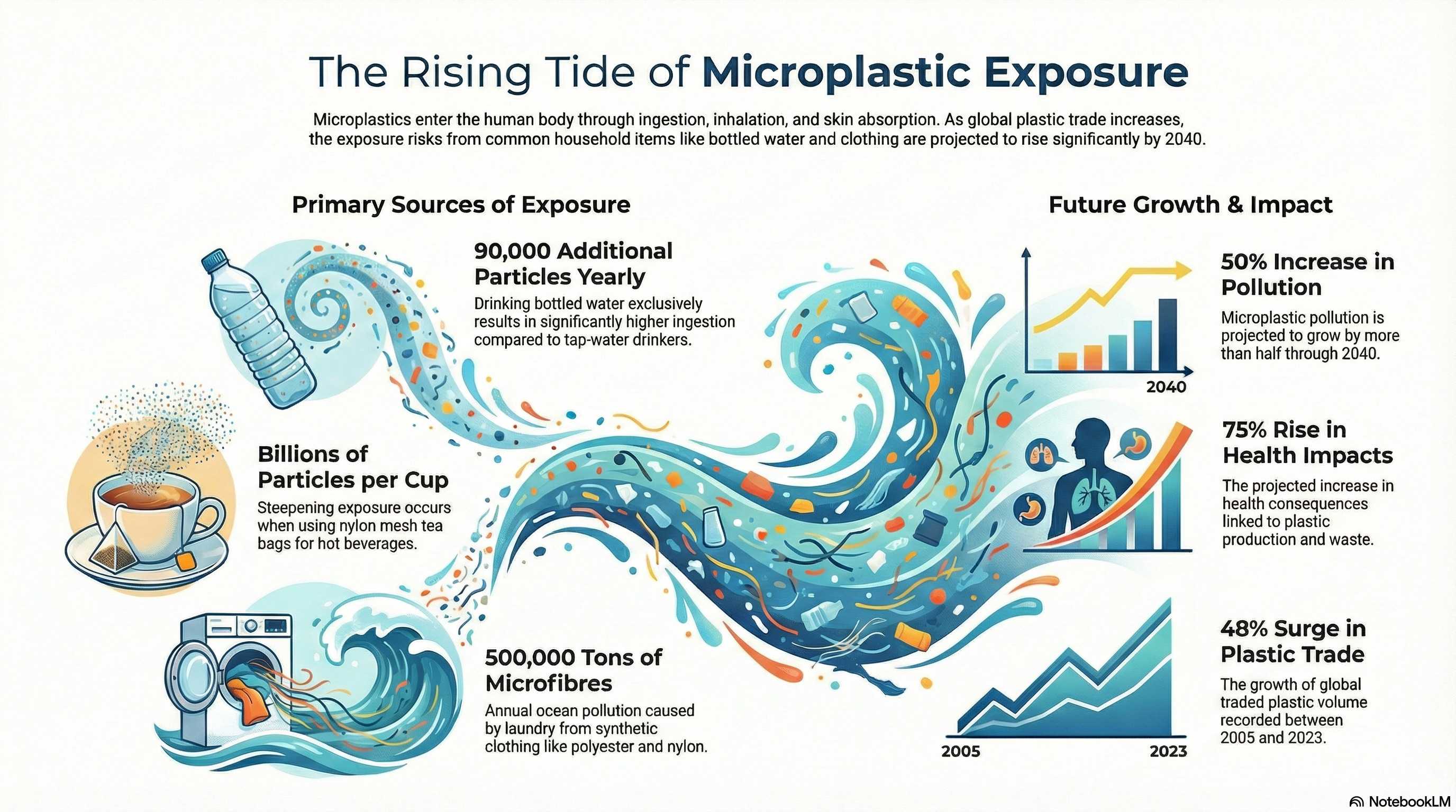 From 2005 to 2023, global traded volume of plastics increased 48%, and one report projects microplastic pollution will grow >50% through 2040, with health impacts from plastic production/waste increasing 75%.